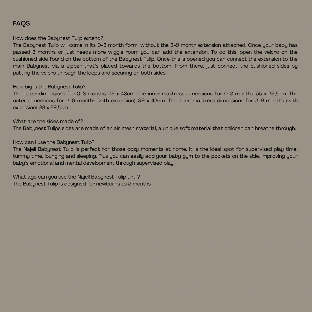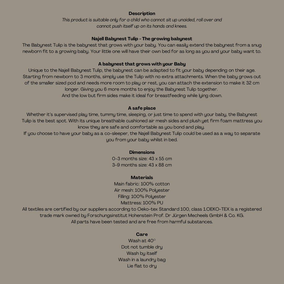 The Najell Baby Gym Arch is a flexible soft play arch that can be used at home or on the go. It is both portable and made to fit in the Najell SleepCarrier Vol. 3 and the Babynest Tulip. Easily attach your baby gym toys and provide your baby with an engaging environment wherever you are.
